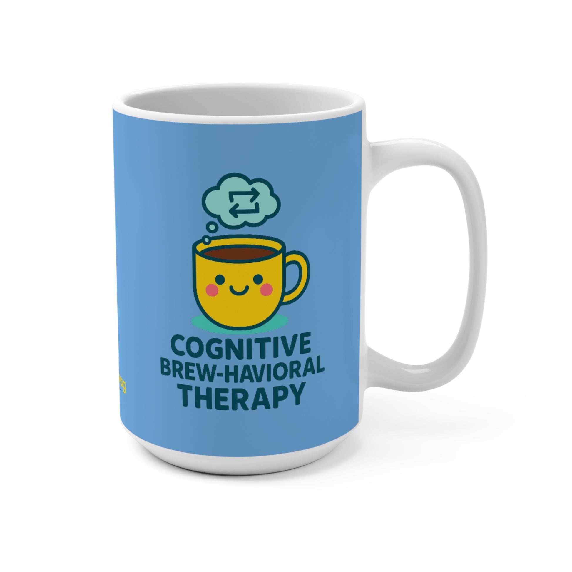 Bright, cheery, and quietly clever—this 15oz ceramic mug brings a little optimism to the morning routine. A smiling mug illustration and the playful line “Cognitive Brew-Behavioral Therapy” sit against a calming sky-blue backdrop, turning coffee or tea into a small, mindful ritual. It suits someone who works with the mind—therapists, counselors, psychology students—or anyone who enjoys brainy humor and a gentle reminder to pause and reframe. The large capacity holds an extra pour for long sessions or late mornings, while the comfortable C-handle and rounded edges make every sip feel easy and familiar. Durable, safe, and ready for everyday use, it slips into a dishwasher or microwave without fuss and keeps its crisp colors through regular wear.