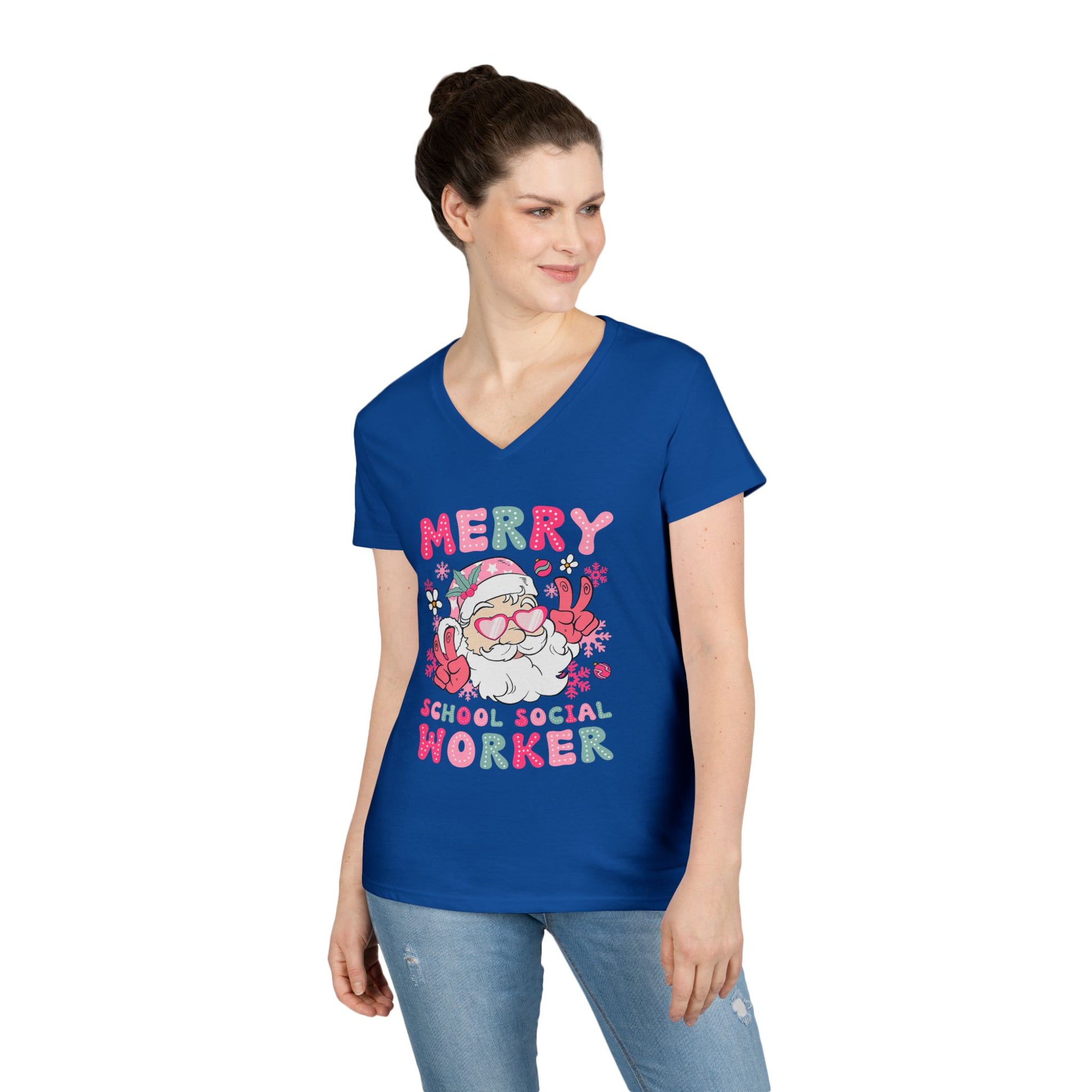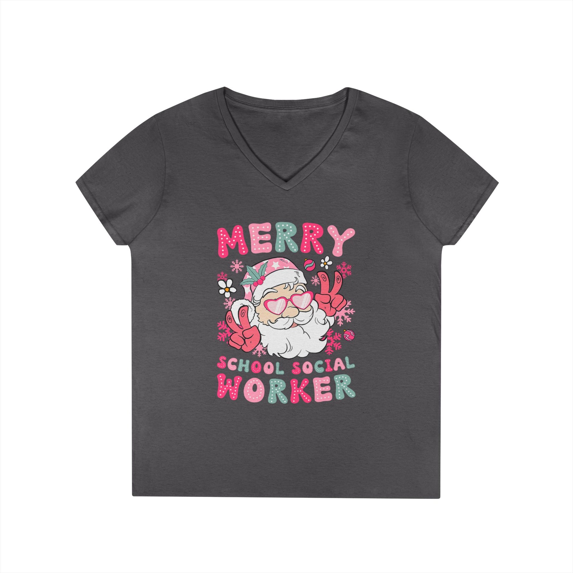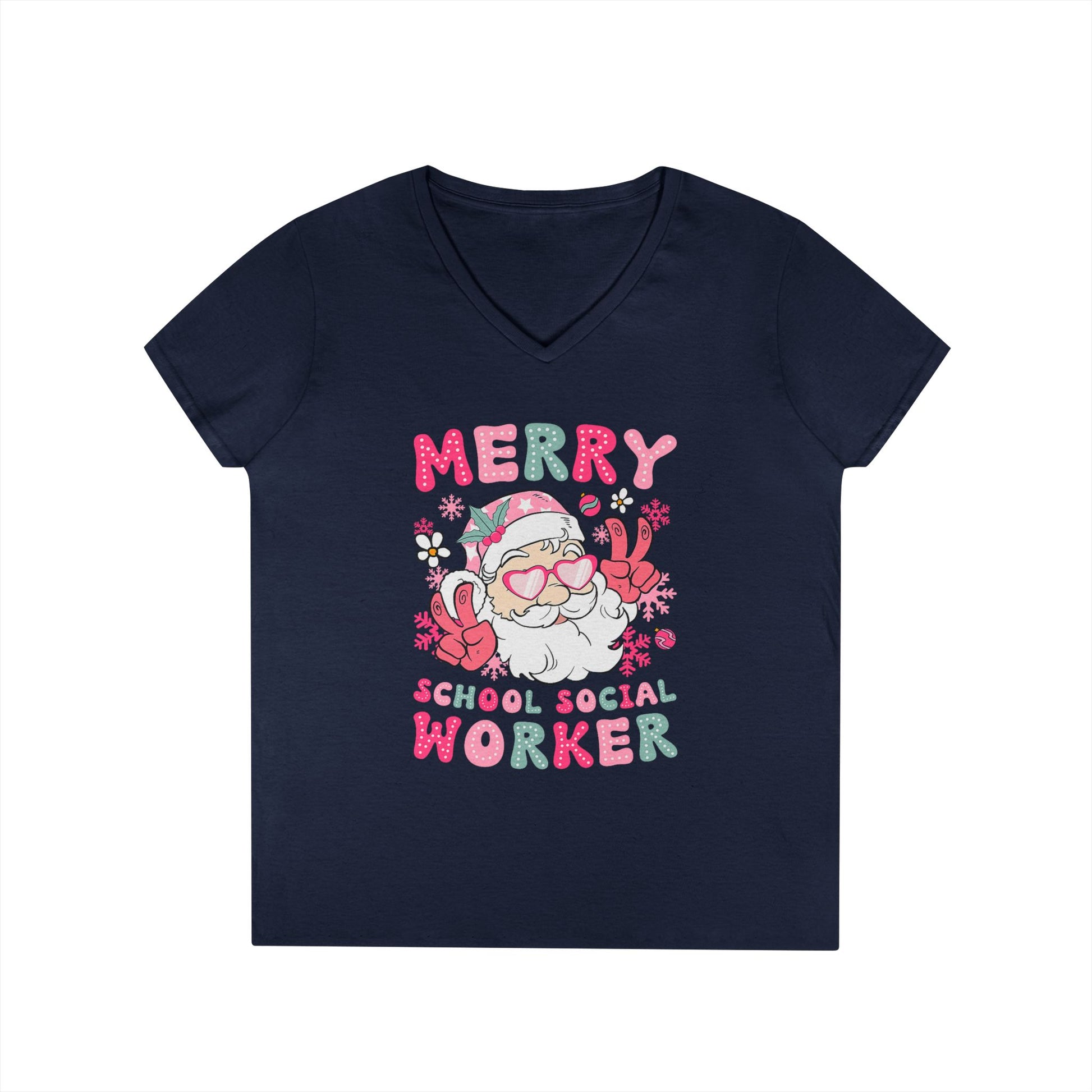 Merry School Social Worker V-Neck Tee — Cute Santa Holiday Shirt for Female Educators