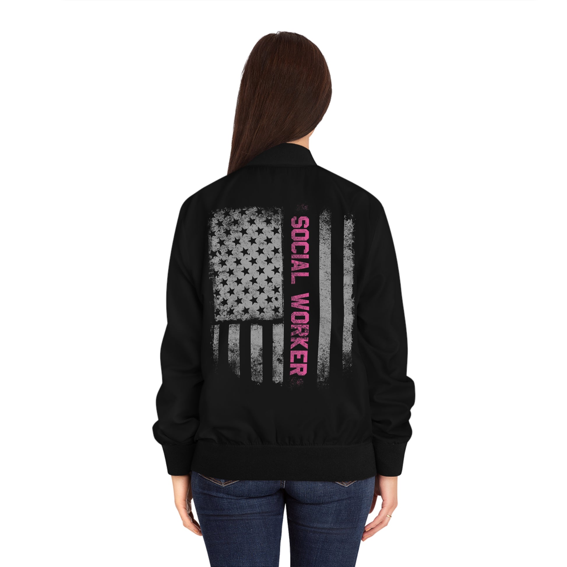 This bomber jacket is a quiet, confident layer made for the woman who carries care into every corner of her life. The matte black shell keeps things sleek while a subtle script logo on the chest nods to personal identity. On the back, a distressed flag graphic with a vertical pink "SOCIAL WORKER" stripe turns pride into a low-key statement — worn at team meetings, community events, or on long days between visits. The ribbed collar, cuffs, and hem hold the shape so it moves with you. Lightweight polyester gives it quick-dry durability for unpredictable schedules, and slanted front pockets keep essentials close. It’s a regular-fit bomber that balances professional warmth with everyday wearability.