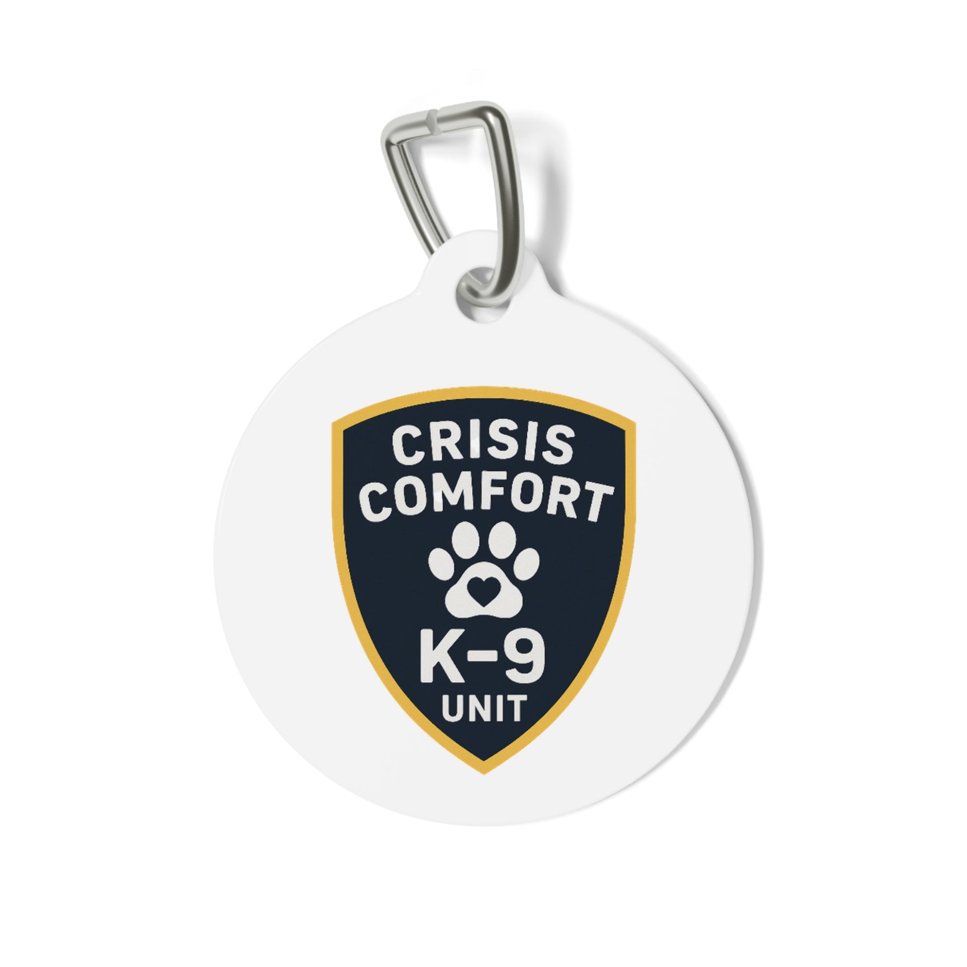 Small, sturdy identity tags made to travel everywhere your dog goes. These 1" round metal discs have a glossy, full-color design on both sides and a solid, one-piece construction so they stay looking sharp through walks, training sessions, and therapy visits. The badges read like little uniforms — bold navy shields and paw icons that quietly signal your dog’s role as a comfort or therapy animal. Lightweight but durable, they clip on with the included metal clip and sit flat against a collar without flapping or peeling. They bring a calm, professional look that complements service- or therapy-focused routines and the comforting presence your dog brings to people in need.