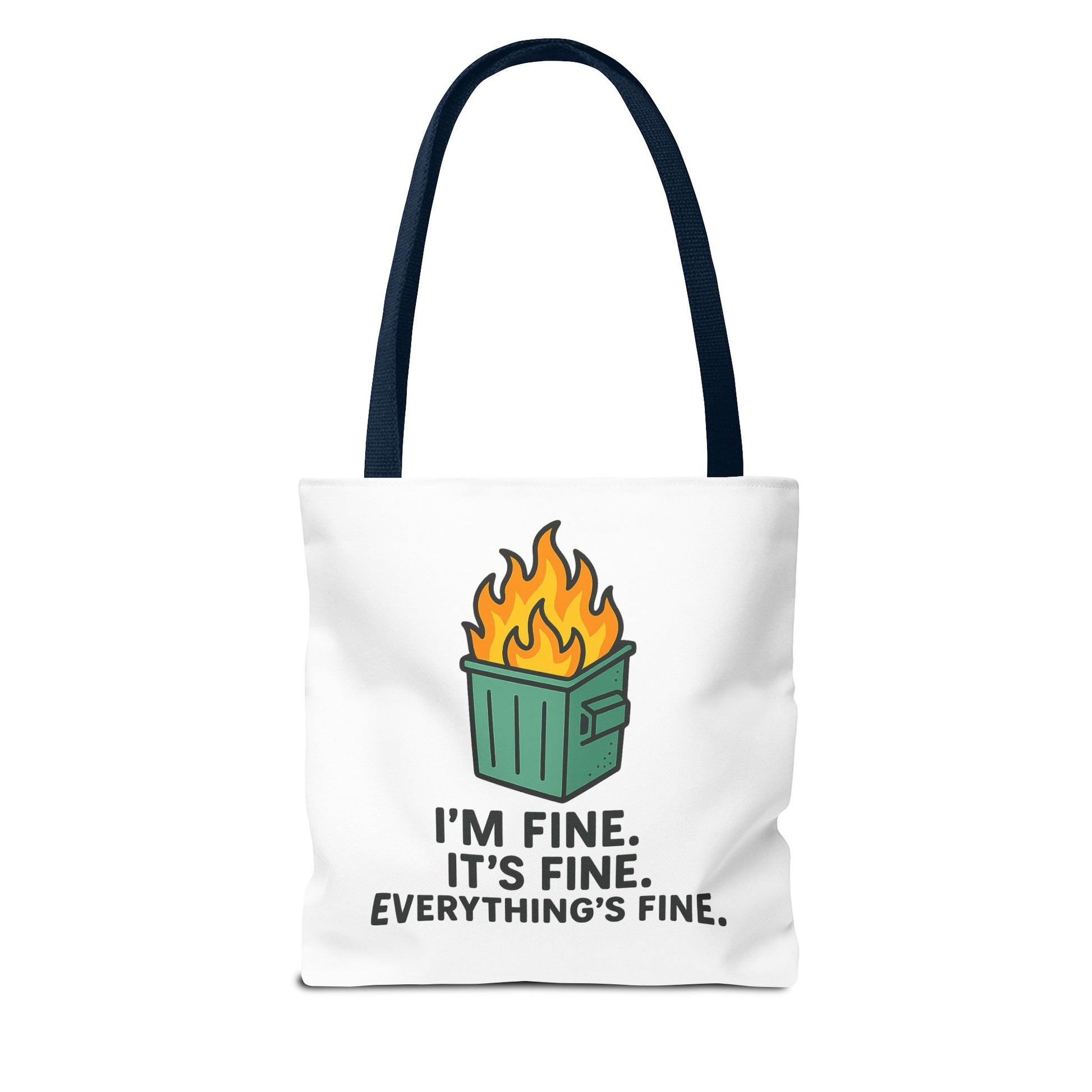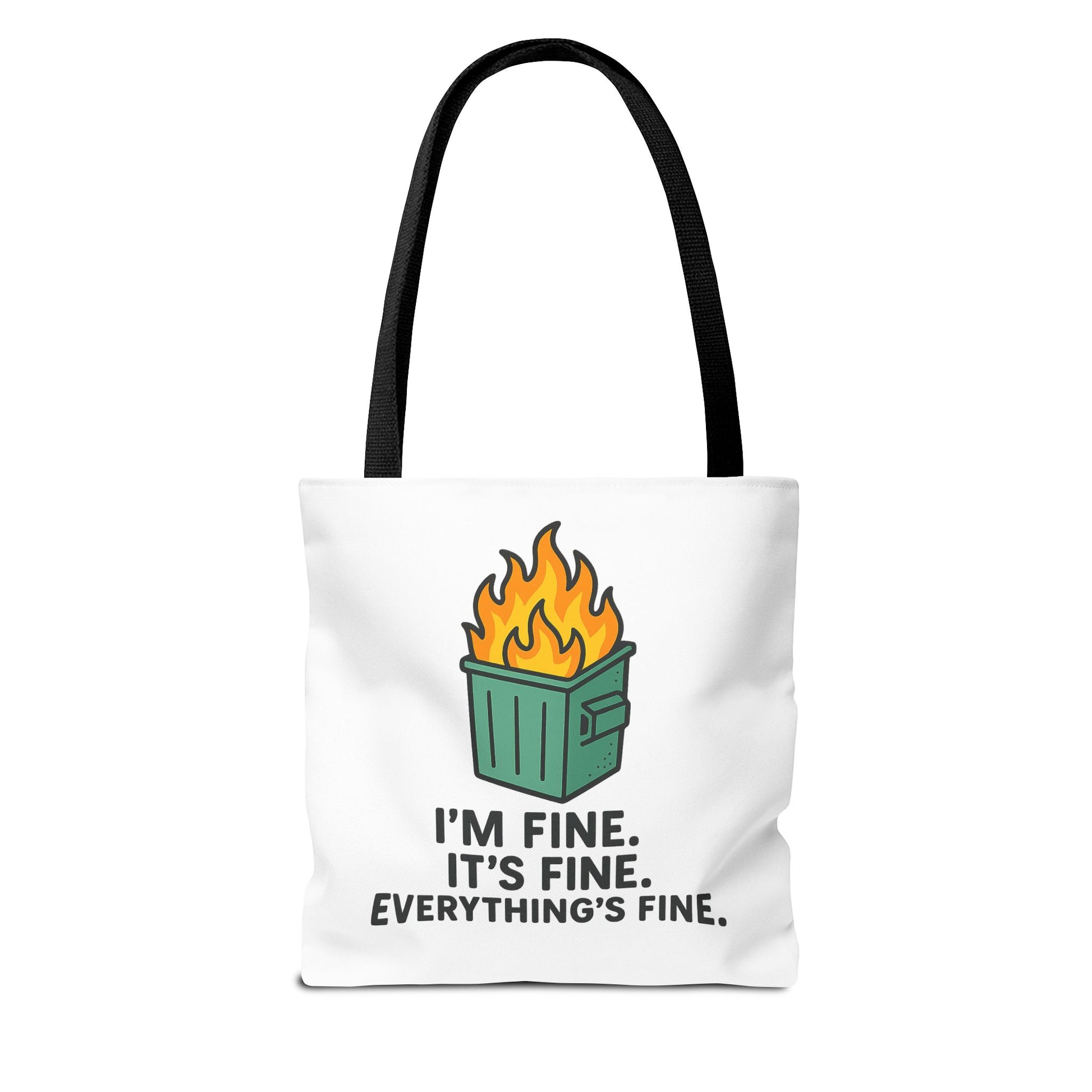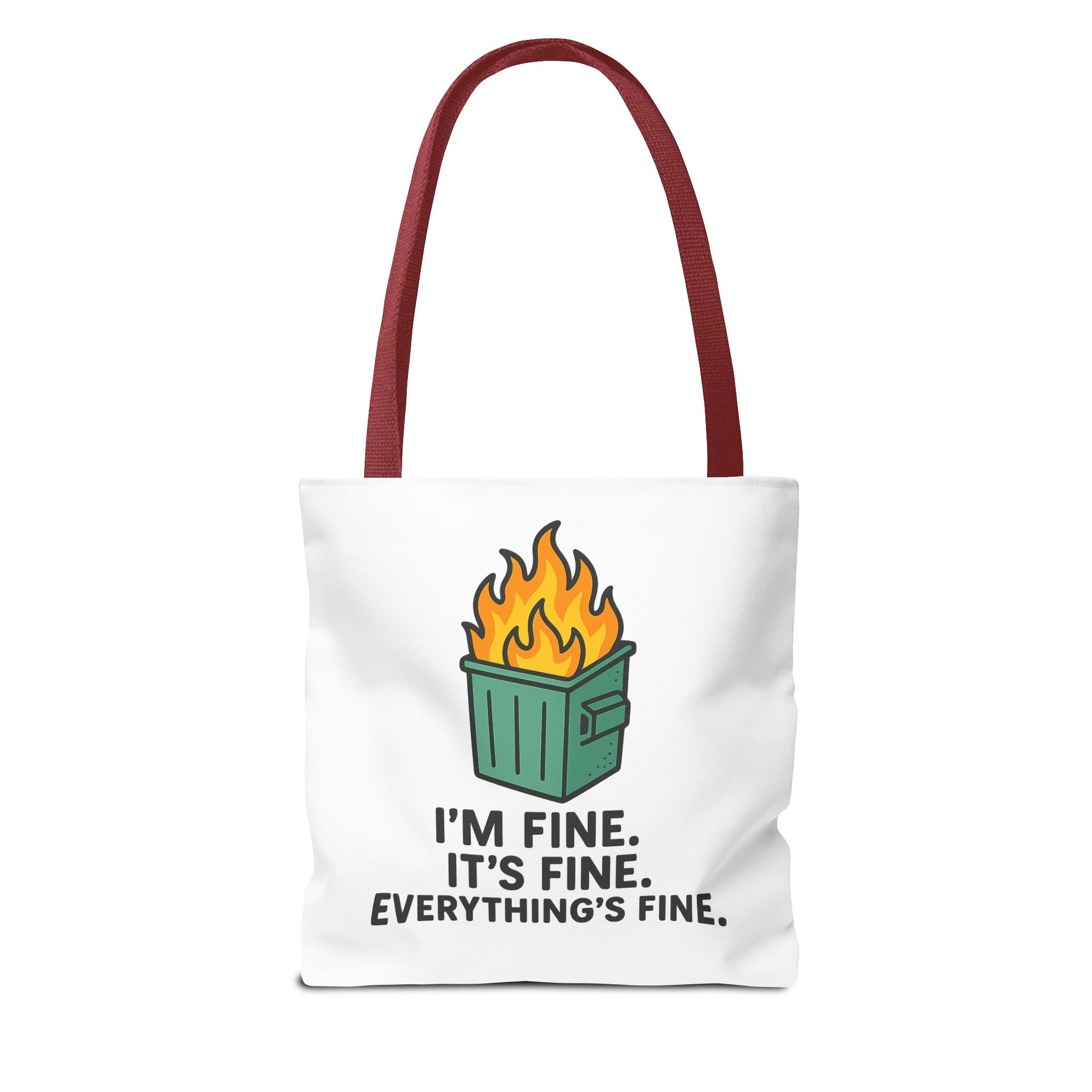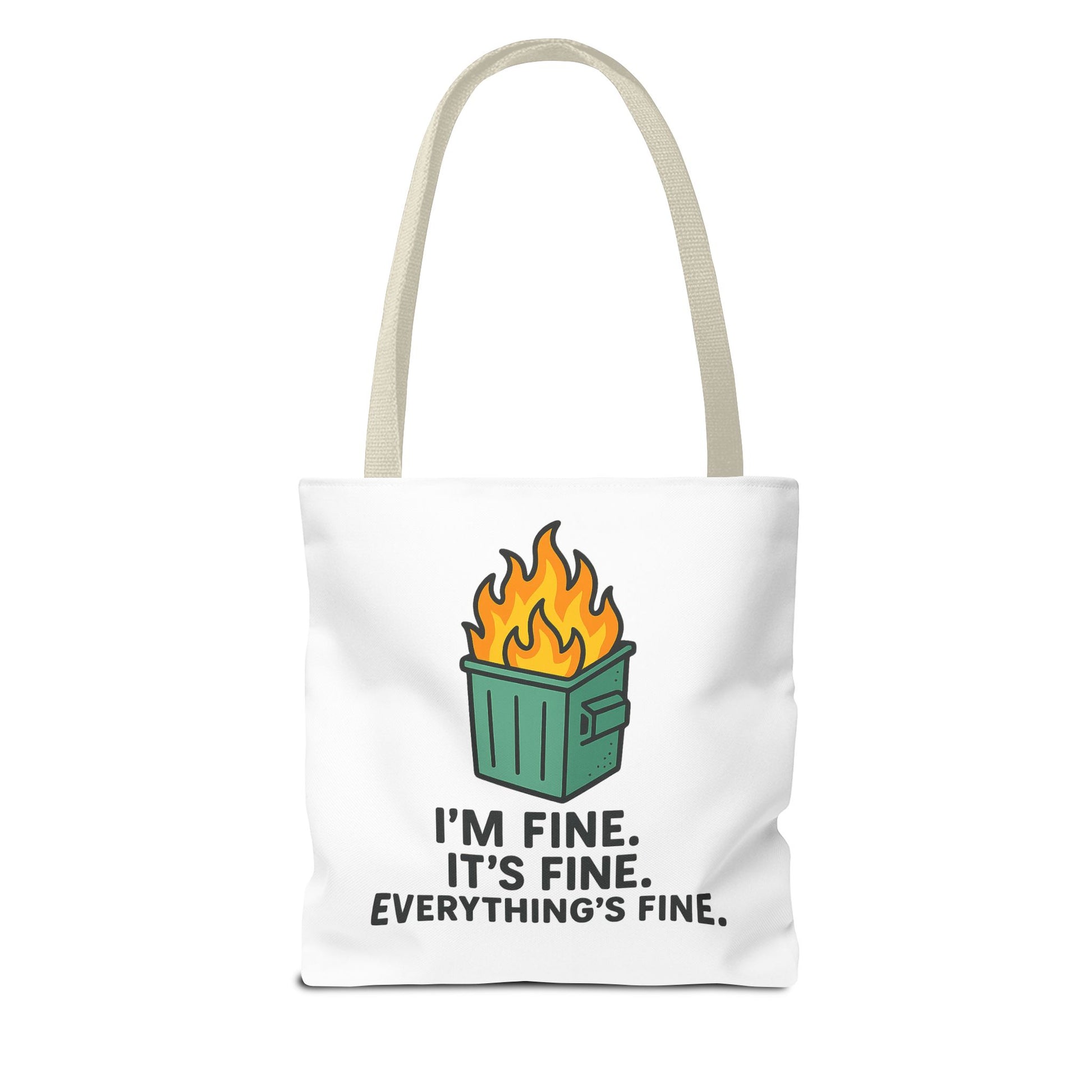 Carry your sense of humor into the everyday with this durable printed tote. The playful flaming dumpster graphic and bold caption — “I’m fine. It’s fine. Everything’s fine.” — brings a wink to chaotic mornings, busy commutes, or last-minute errands. Lightweight yet sturdy, the bag holds its shape and offers roomy boxed corners for groceries, work gear, or a weekend’s worth of finds. The clean white canvas lets the colorful illustration pop, while black inner stitching and your choice of handle color add a tailored touch. It’s the kind of bag that starts conversations and lightens the load when life feels a little out of control.