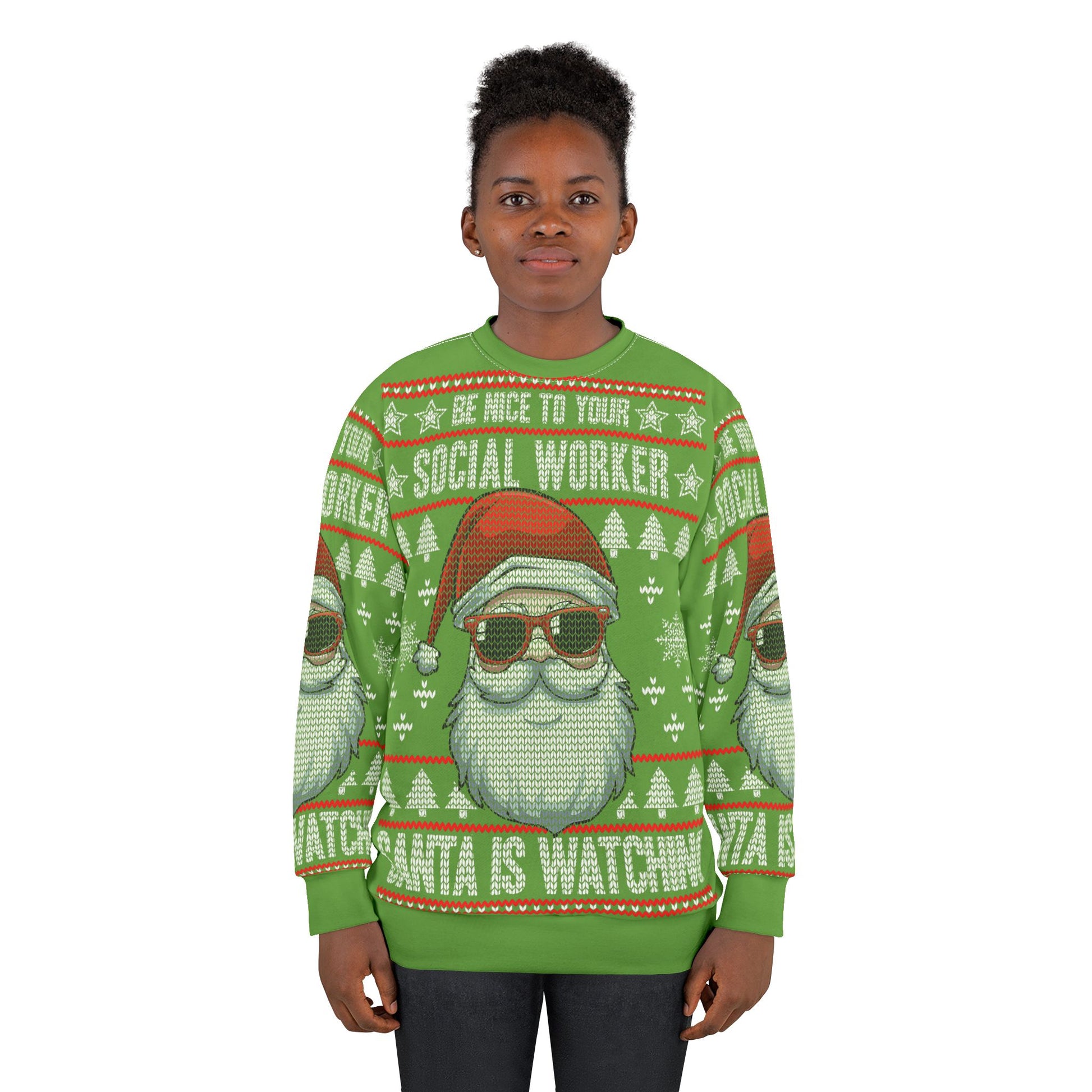 This vibrant all-over print sweatshirt brings holiday cheer with a cheeky twist. A retro knitted-look Santa wearing sunglasses is front-and-center on a bright green background, framed by playful fair isle motifs and the bold message “Be nice to your social worker — Santa is watching.” The medium-weight polyester holds the intense colors of the full-coverage design so the image stays crisp and festive through wear. Classic crew neck and ribbed 1x1 cuffs keep the silhouette familiar and comfortable, while the custom cut-and-sewn construction ensures the pattern lines up across seams. Wear it to holiday gatherings, staff parties, or casual days at the office to spark smiles and start conversations — it’s a cozy, confident statement piece for anyone who wants to blend humor with seasonal spirit.