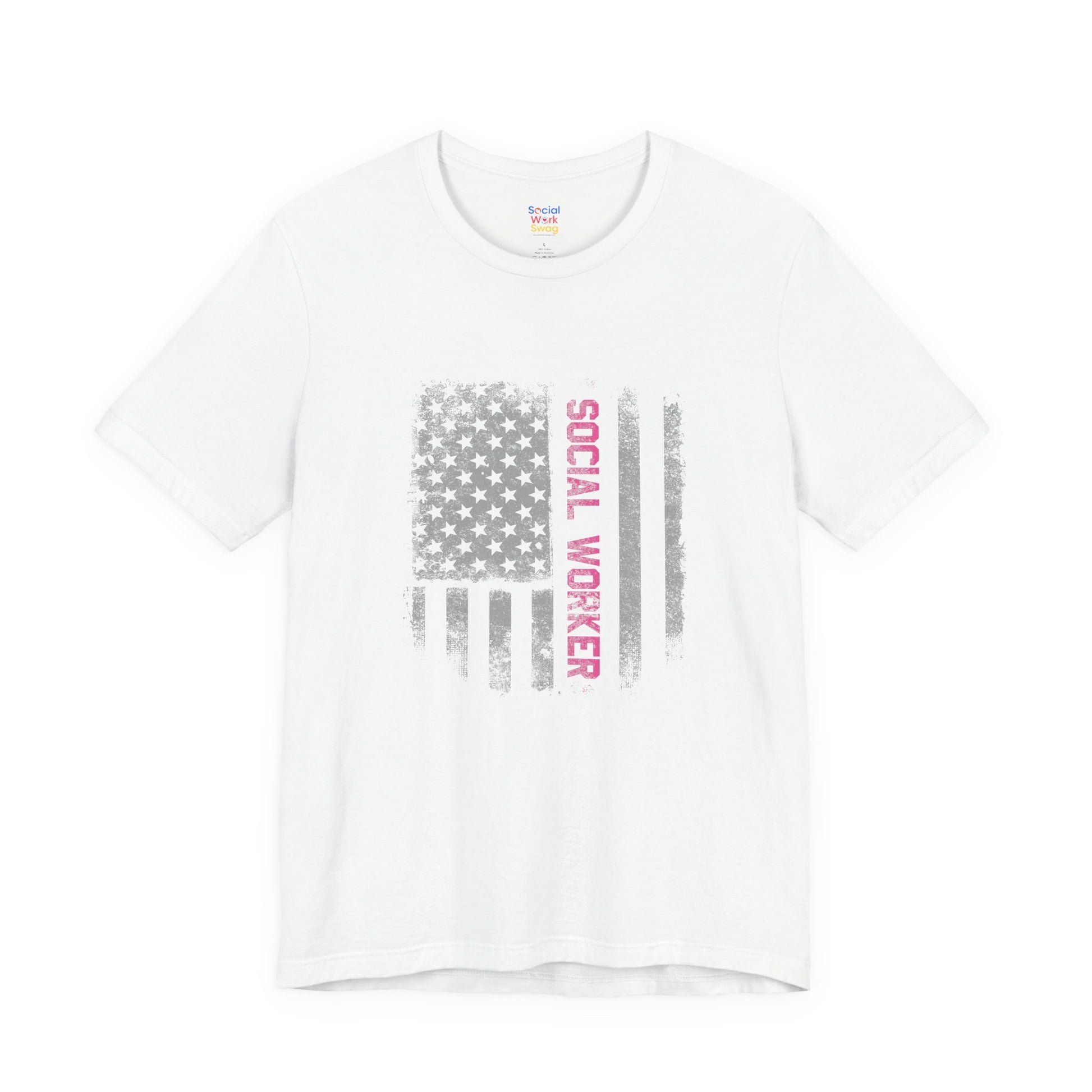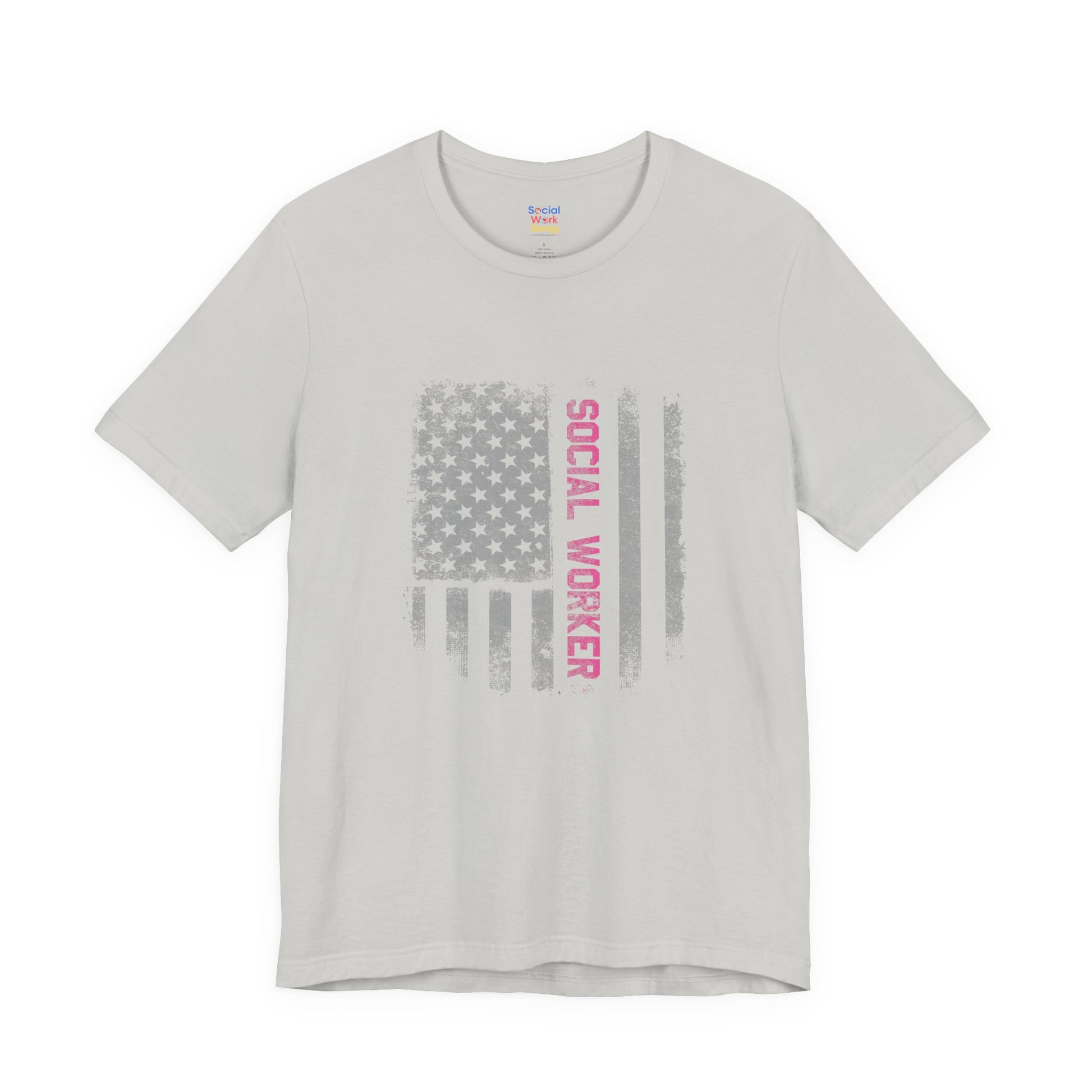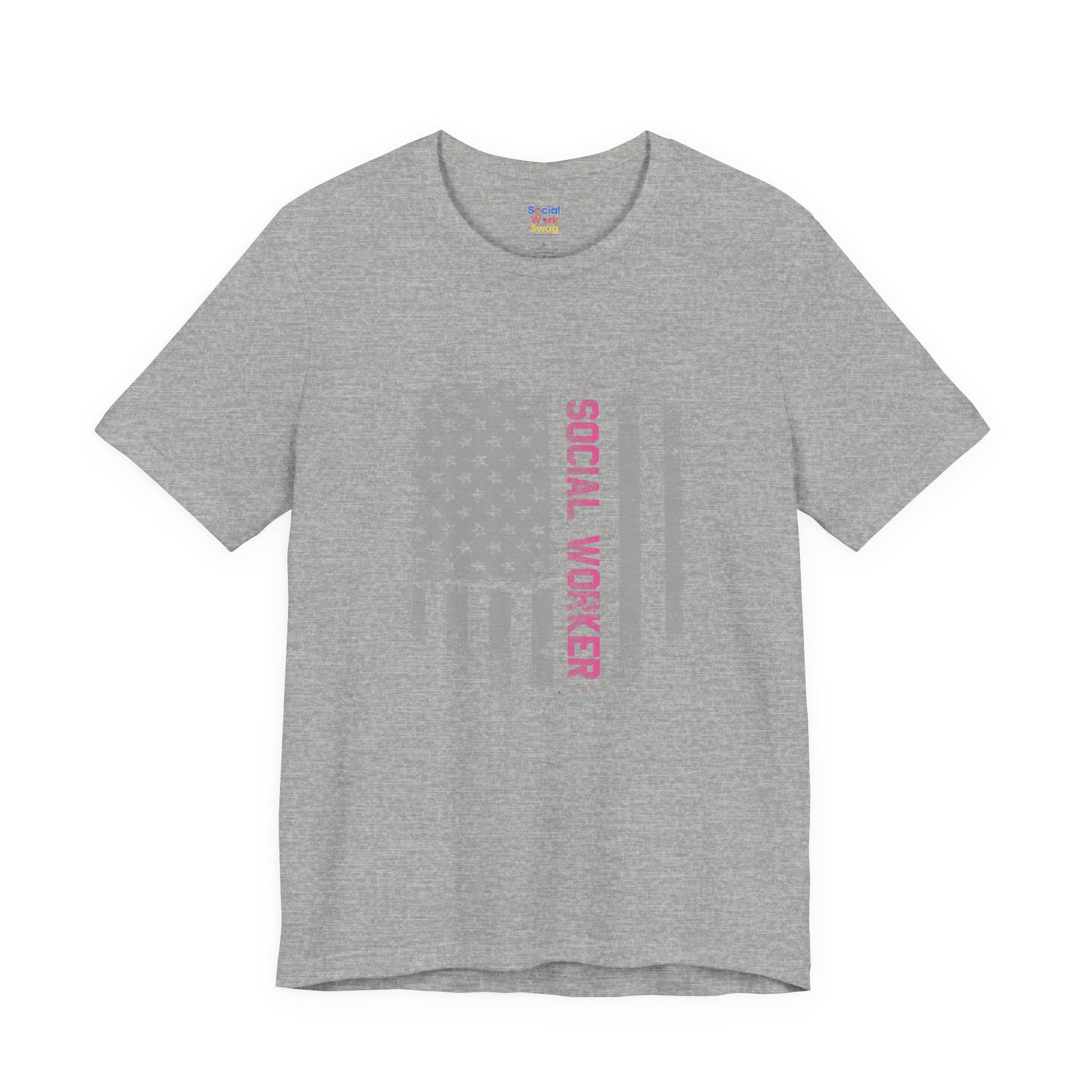 Unisex-Social Worker American Flag T-Shirt — Distressed Gray & Pink Honor Tee