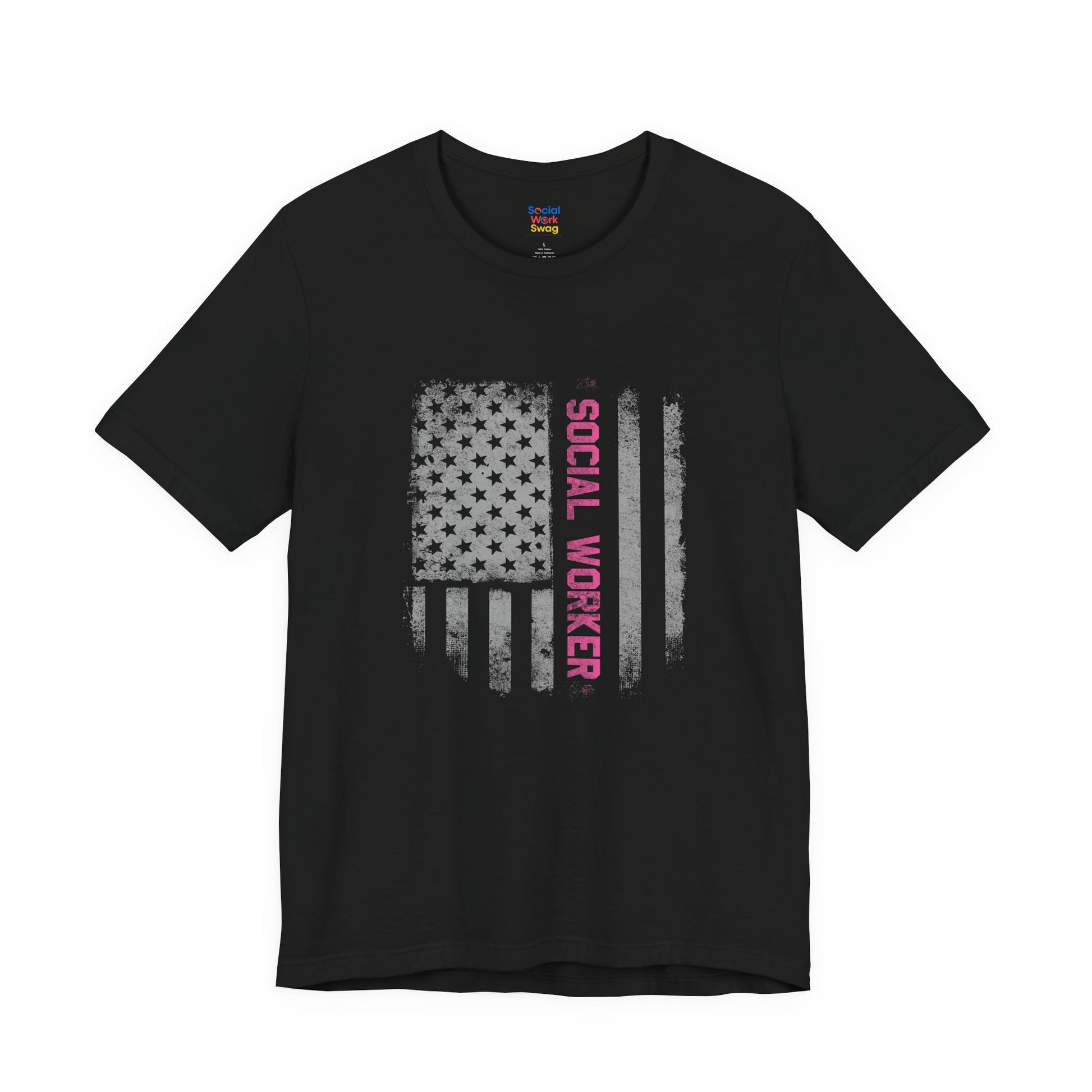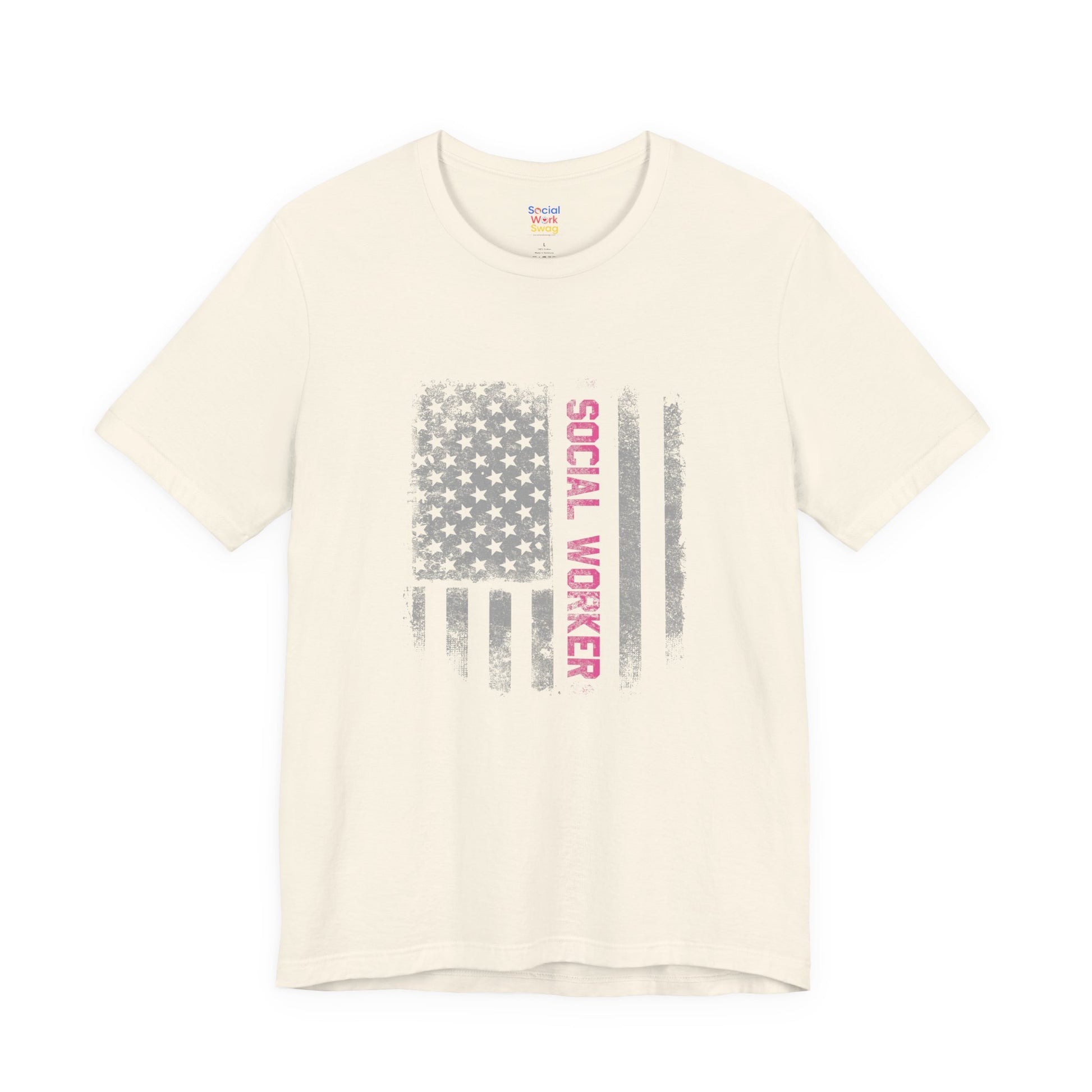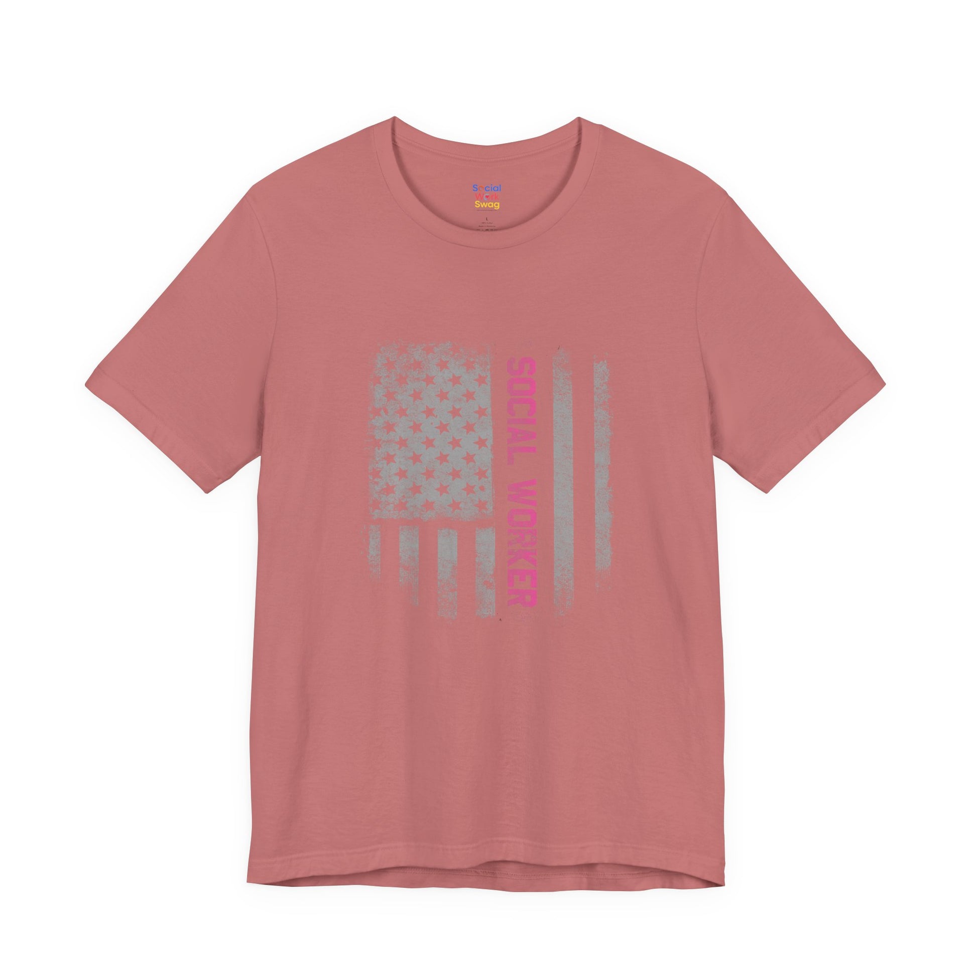Unisex-Social Worker American Flag T-Shirt — Distressed Gray & Pink Honor Tee