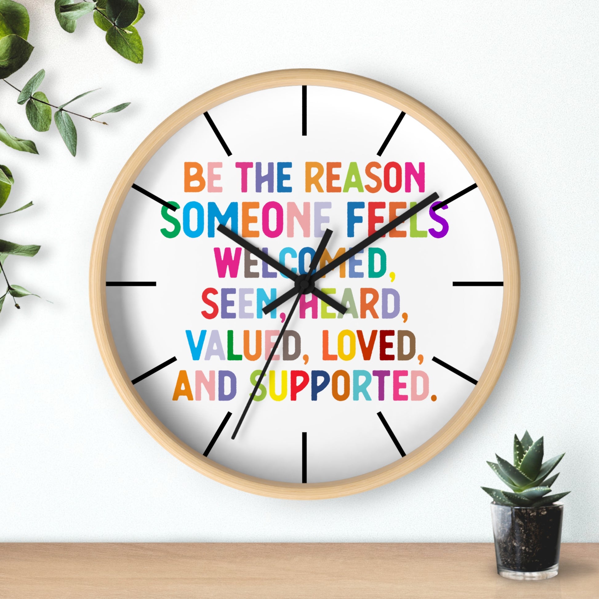 This vibrant wooden wall clock turns a simple timepiece into a daily reminder of kindness and belonging. A colorful, bold typographic message — "Be the reason someone feels welcomed, seen, heard, valued, loved, and supported" — fills the white face, printed with vivid inks that pop against the natural wood frame. The slim profile and silent mechanism make it right for quiet rooms where its message can be read and felt without distraction. Easy to hang with a pre-installed hook and powered by a single AA battery, it’s a cheerful accent that brings warmth and intention to entryways, classrooms, offices, or living spaces.